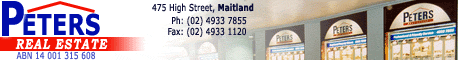 PETERS REAL ESTATE is a family business, which has been serving the community of Maitland and Lower Hunter areas since its establishment in 1971. Under the management of TIM PETERS the firm offers a comprehensive and professional service in the following areas: - ·Residential Sales ·Rural Sales ·Commercial & Industrial Sales ·Registered Real Estate Valuations ·Property Management for Residential, Commercial & Industrial Properties PETERS REAL ESTATE is located 200 metres west of the mall in the Central Business District with ample parking nearby. All team members attend regular training and pride themselves on the professional service they offer. The firm services all suburbs of Maitland as well as the surrounding areas of Lochinvar, Greta, Branxton, Kurri Kurri, Beresfield, Tarro, Woodberry, Paterson, Gresford, Vacy, Brandy Hill, Sawyers Gully and Mulbring. Maitland is located approximately 30 minutes west of Newcastle and two hours to Sydney. The area offers a peaceful rural lifestyle whilst enjoying the comforts of a short drive to national forests, beaches, wine country and regional shopping centres. |